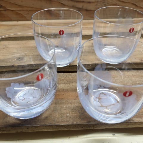 To, flotte Gaissa fra Iittala. Designet av Tapio Wirkkala tidlig på 70-tallet. Til whiskey eller cocktail. Med originaletikett. Tung, god bunn og ligger godt i hånda. Rommer 28 cl