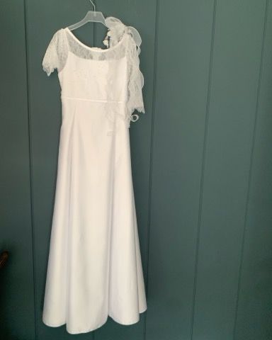 Kjempefin brudekjole i off-white med perler og jakke. Brukt bare en gang. Størrelse: small