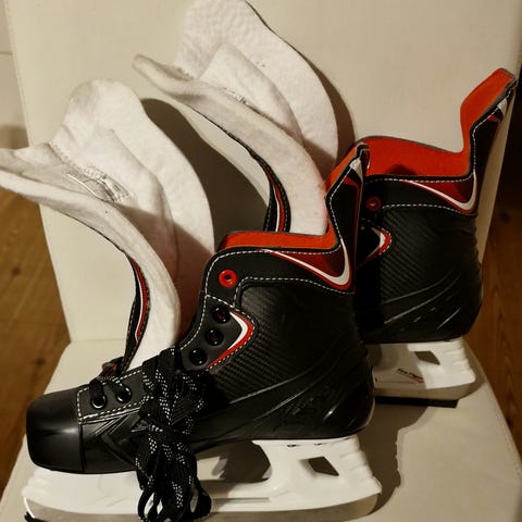 Selges fordi de er kjøpt på nettet og var litt for små. De er litt mindre i størrelsen enn Bauer og CCM (marginalt større enn Bauer i skøytestr 1 som vi hadde fra før)