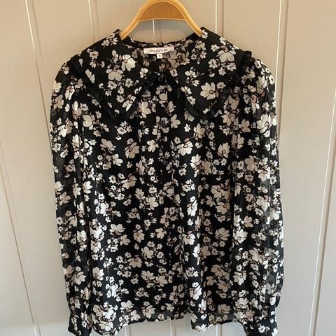 Floyd bluse/topp str S. Sort bunn med blomster. Strikk nederst og på ermene. Den er ubrukt, men lappen er tatt av.
