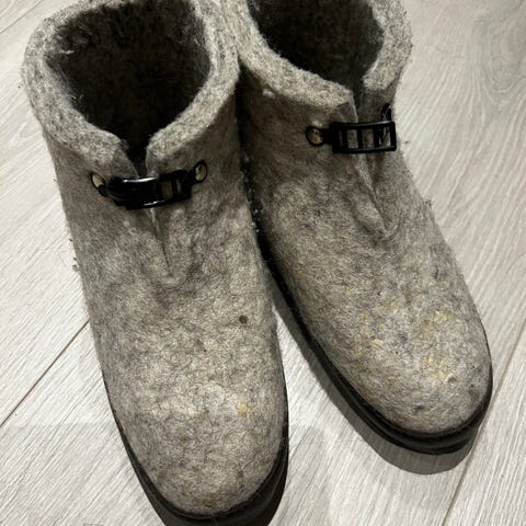 Klassiske tøfler i filt fra Husfliden. Håndtovet i 100% merinoull.