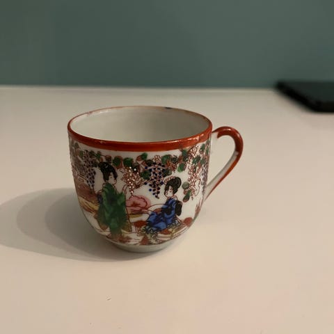 2 grønne med hvit kant 2 blå med hvit kant, liten fløtemugge. Kan være gamle