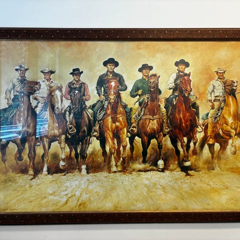 Stort flott maleri på duk av en gruppe Indianere til Hest over en elv....total størrelse inkl. ramme ca 128¤89cm.........Et stort maleri for den som ønsker noe spesiellt......Kjøpt i London for ca 20 år siden.........uten signatur/utydlig signatur,,,,,,må hentes.