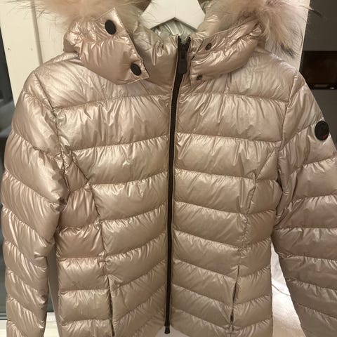 Selger min fine rød jott lett dun jakke. Den er i str M, men er litt liten i størrelsen. Lett tur jakke, men varm og god.