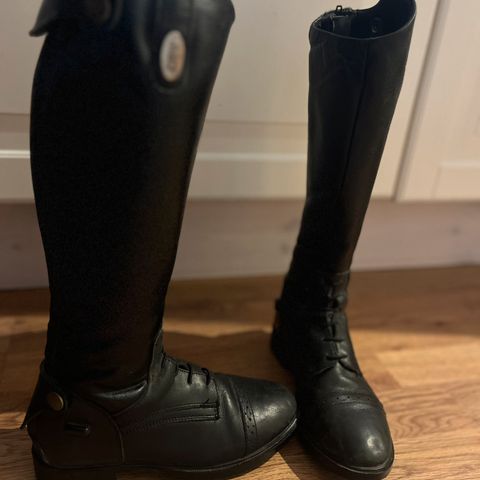 Nesten nye ridestøvler i lær i str 38. Brukt to ganger, men har innsett at de blir litt for store for meg. Passer fint for oss med kraftig legger.