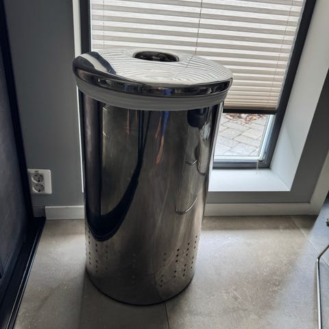 Pent brukt skittentøyskurv, den har en liten stilasje på skinnet til topplokket. Men har ingenting å si for bruk. Ta kontakt!