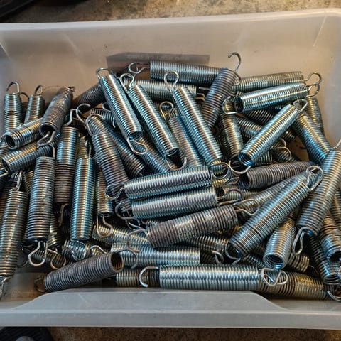 To skumtuber som festes rundt stengene på trampolinen (lengde ca 43,5 cm). 32 strikk med kuler. Strikkene kan også brukes for å fikse presenninger, telt, flagg, tepper osv. Pakke med 12 stålfjærer som er ca 4 cm lange.