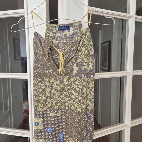 Hette, vide ermer, snører i ermer, bak og nede.