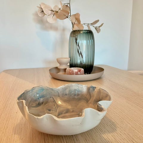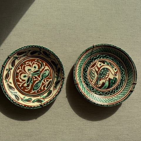 Pent sett, bestående av en skål (diameter 16.5 cm) og et fat (diameter 20.5 cm) i håndlaget og hånddekorert keramikk. Bunnfarge er naturhvit, og dekoren er i bruntoner og grønn. Aldri brukt, kun stått til pynt.