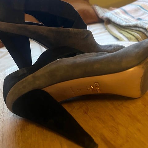 Hælhøyde 12 cm. Ble for høyt for meg, så håper morn andre kan få glede av dem. Semsket og sling back og masse herlig glitter,