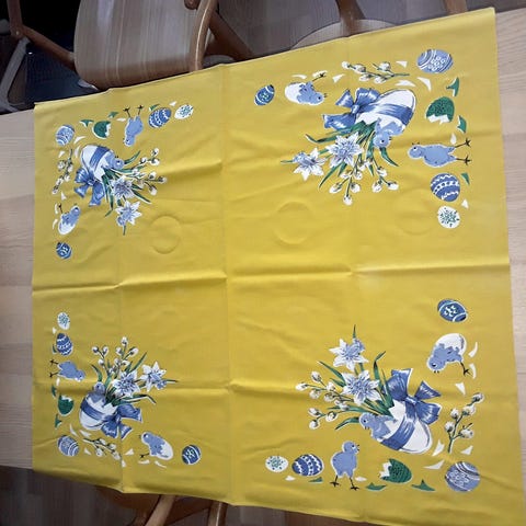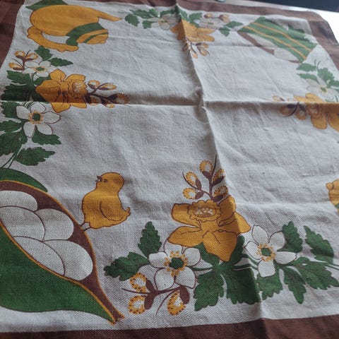 Søte kyllinger i hvert hjørnet og en krans i midten. Bunnfarge hvit.