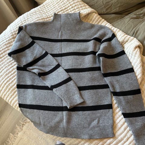 Selger en pent brukt genser med høy hals og beige og sorte striper, strikket i ull og alpakka-blanding. Behagelig på. Klør ikke.