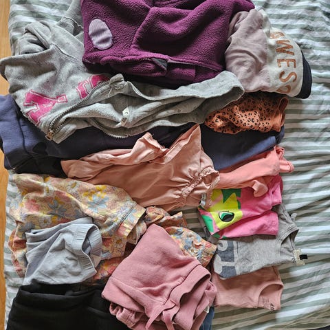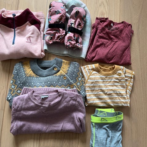 Inneholder fleecegenser (karsten og petra), lilla sett i blandingsull + ekstra bukse i annen farge, rød ullbukse fra janus (sydd et hull), tre par ullsokker med blandingsull og en ubrukt hals. Selges billig da det synes at klærne har vært i bruk.