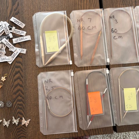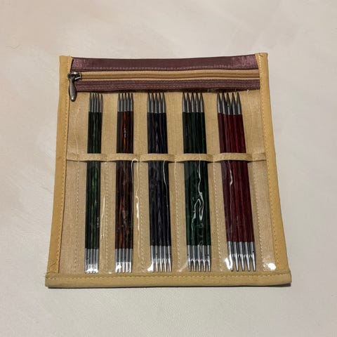 Selger sett med helt nye parpinner for jeg bare bruker rundpinner. I fin mappe. Kommer fra diverse kilder. Noe metall, noe bambus, noe tre.