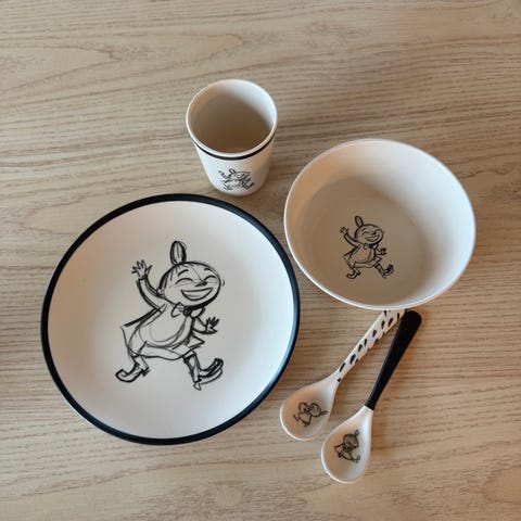 Melaminservise med mummimotiv. Fat, skål, kopp og to skjeer i veldig god kvalitet. Brukt, men heile og utan hakk.