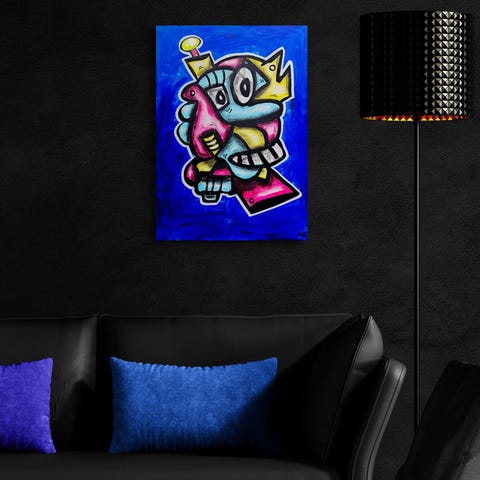 Det er jeg som har skåret ut og malt figuren. Jeg maler normalt slike motiver ute på gata. Den er tenkt som en fargerik pyntegjenstand som passer inn i bokhylla.