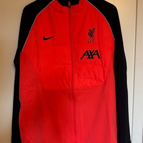 Offisiell Liverpool FC treningsjakke, fra noen år tilbake. Rød, med svart stripe på hver arm. Klubbens logo er brodert på venstre bryst. Glidelås foran, to lommer og elastisk ribbestrikk i krage og mansjettene. Romslig modell, kan nok passe M også. Pent brukt. God kvalitet. Sender gjerne til nye supportere😁