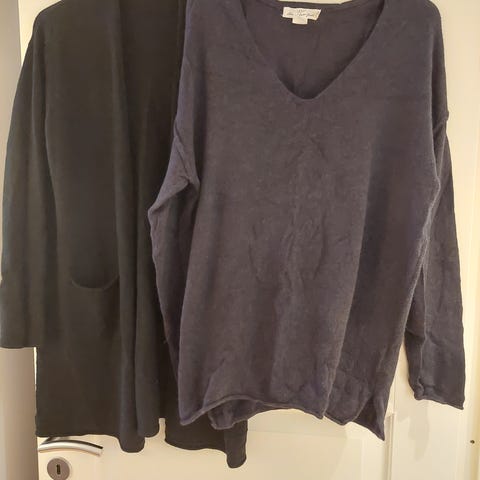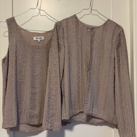 Pent sett med kortermet topp og langermet cardigan i supermyk angoraullblanding fra Newhouse. Brun med kobberbrune paljetter. Lukking av cardigan med en knapp i halsen. Toppen er strl L, jakka strl XL. Nesten ikke brukt, noen nupper, men ellers helt og pent.