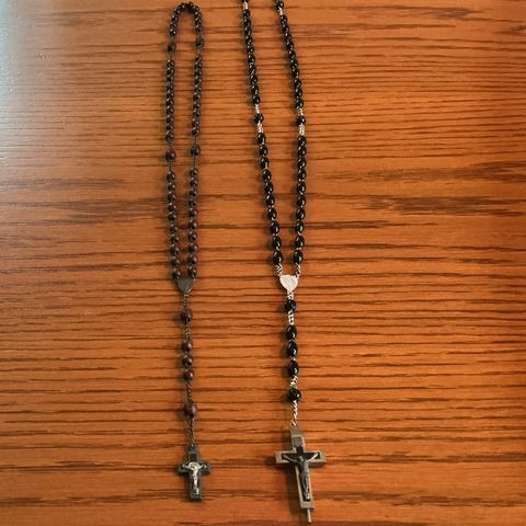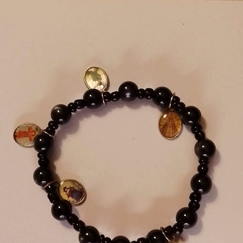 Håndlagde Rosenkrans armbånd selges. Sorte perler i akryl i ulike størrelser med kors dekor og sølv detaljer.