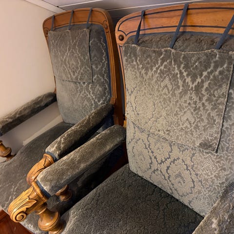 Selger en kjempeflott antikk stol som er i perfekt stand.Den ene er solgt.. Ingen skade hverken på skinn eller treverk.