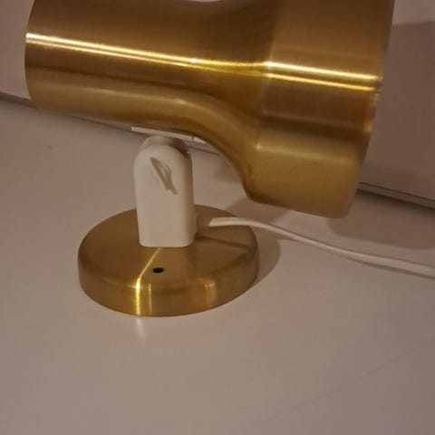 Fin brun lampe, fra 60- eller 70-tallet? Kan festes til hyller o.l. med en klype. Se bilder dor mål. Fullt fungerende, ujordet støpsel. Kan sendes eller hentes.