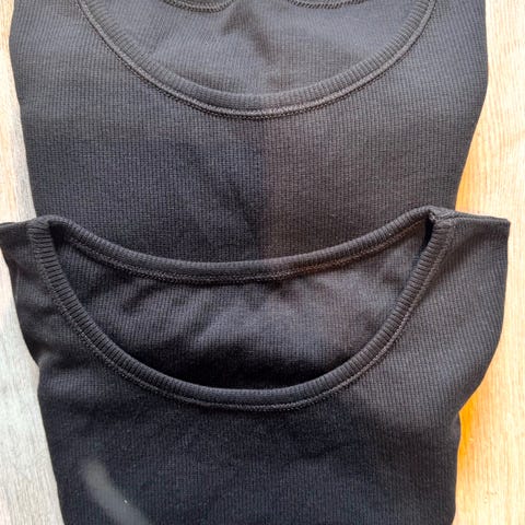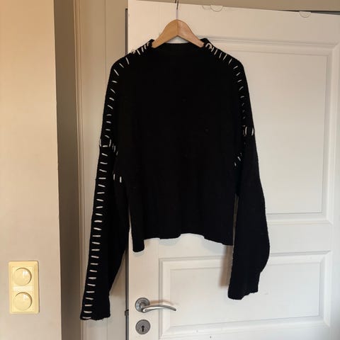 Genser i blått, grått og svar med asymmetriske felt selges. Den er merket "Retro" med lapp foran, men den har ingenting inni, så jeg tror denne er hjemmesydd / privat sydd. Ca. str. 40. Stoffet er "melert" og har en del bittesmå hvite prikker som ser ut til å være en del av stoffet. Det er grove sømmer inni, så jeg innbiller meg at den er mest behagelig på med en skjorte eller tynn genser inni. Ellers er den fint sydd og en ganske spesiell genser!