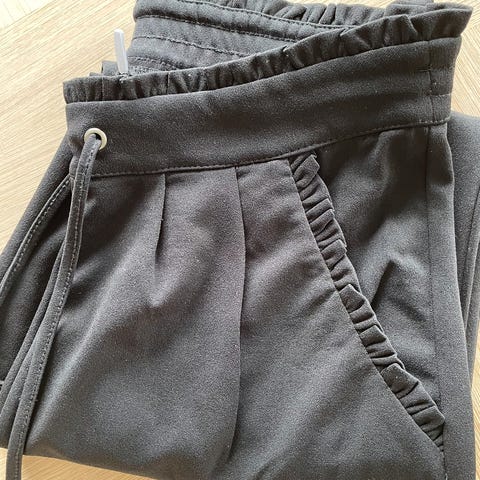 Bukse fremstår som så å si nesten ny, lite brukt. Jeg har dsv klippet vekk vaskeanvisningen, men buksen fremstår som det er lite syntetiske stoff i den, jeg synes det kjennes ut som mye viskose i den og stoffet er litt kraftigere. Veldig strechy stoff.