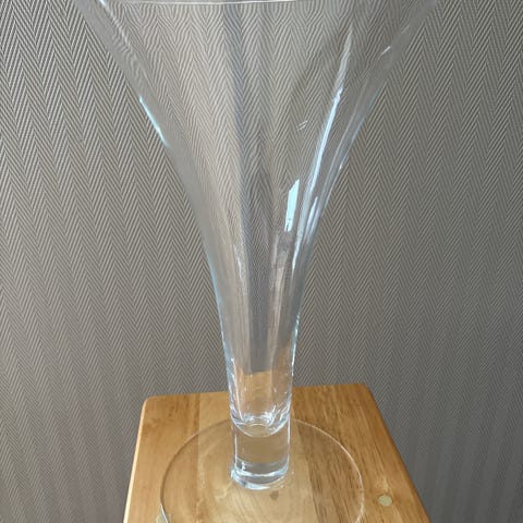Hel og pen vase I glass. Den er ca 26 cm høy, og åpningen er nesten 8 cm.