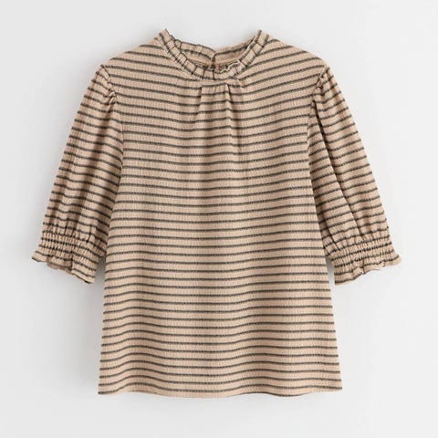Lang, tynn og lett skjorte med strikk i midjen, brystlommer, sidelommer og skjulte knapper.