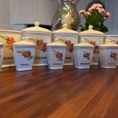 Krukker til mel, salt og sukker selges samlet for 300kr. De er ca 14 cm høye og ca 9cm i diameter. Ingen anmerkninger.