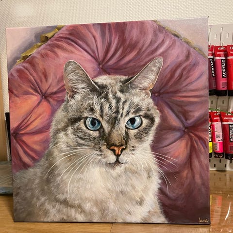 Bilde av katten Per er tatt av meg. Bilde er festet på lerretet med decopage, og bladene og treet er malt på med akrylmaling.
