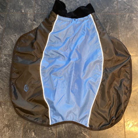 Dekken til hund. Softshell. Lukkes med borrelås. Refleks i kragen. Str xxl. Selges 180,-