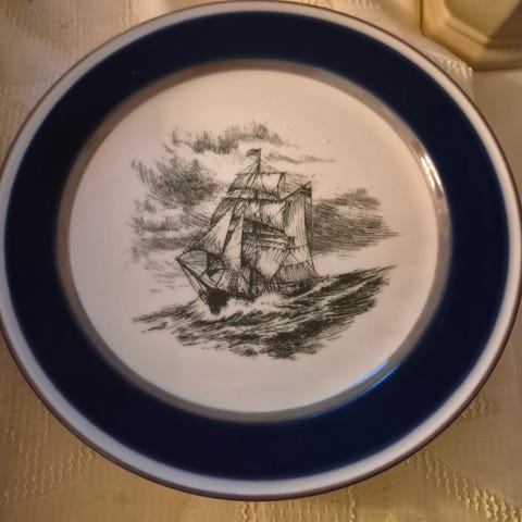 Fat. tallerken. Royal Elma. England. Engelsk. porselen. seilskute. seilskutemotiv. gull. gulldekor. gammel. seilskute motiv. Vintage. Pynte tallerken.