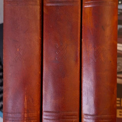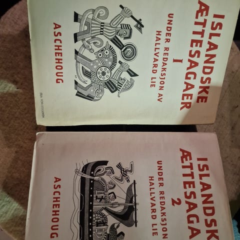 Islandske ættesagaer, komplett i fire bind utgitt på Aschehoug 1951-54. Bøkene er svært pent innbundet med rygger i blått skinn, rik dekor. Bøkene er som nye. Her er det mye spennende lesning! Tekst på bokmål. Kan sende.