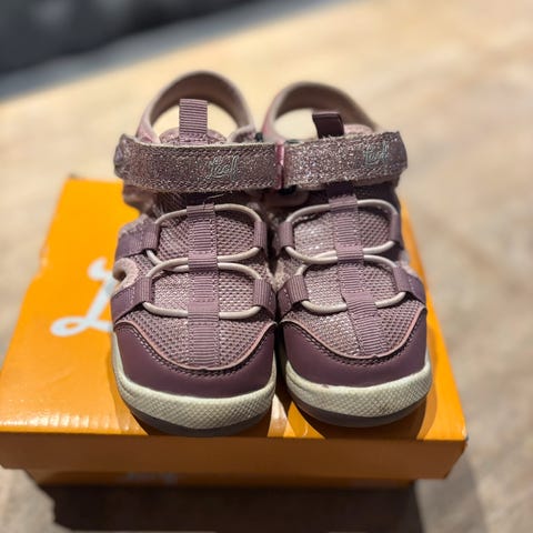 Lilla sandaler med blink, lukket tå og borrelås. God og myk såle. Fra leaf. Virker som god kvalitet. Har vært veldig populære. Borrelåsen er litt slitt, men har fremdeles godt grep. Ellers er sandalene i god stand, med litt overflatemerker.