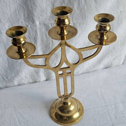Flott messing lysestake med 3 armer i Jugendstil. Høyde 29 cm. Litt patina etter mange års bruk ved juletider. Varm fin glød i messingen.