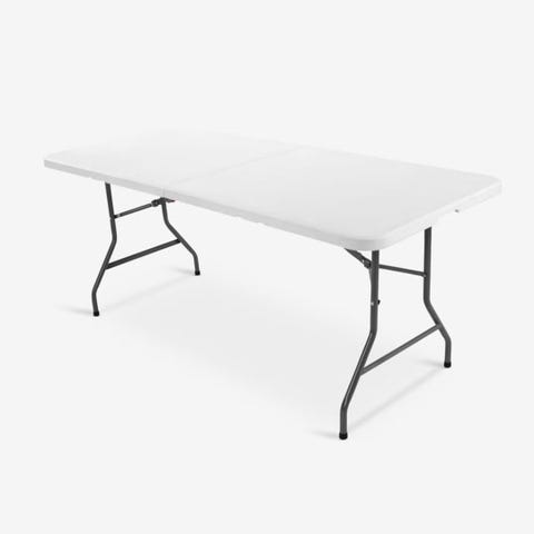 Sammenleggbart bord med bordplate i støpt plast og pulverlakkert stålramme, 180 x 74 x 74 cm. Bordet er sammenleggbart og har et praktisk bærehåndtak.
