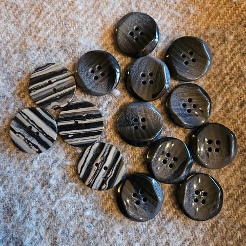 Fargen er svart, og var tiltenkt et redesign prosjekt som nå er skrinlagt🙈. Knappene er ca 3 cm i diameter. Beltet er ca 1,70 i lengde + pompongene. Pompongene er ca 4 cm i diameter. Tror de er laget av bomullsgarn, muligens tilsatt noe syntetisk.