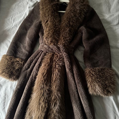 Lang kåpe til dame fra Ella&il i myk fuskepels. Jakken har en avslappet og lang passform, prydet med fluffy pelsdetaljer på kragen og mansjettene. Et stilfullt valg som holder deg varm i den kalde sesongen.
