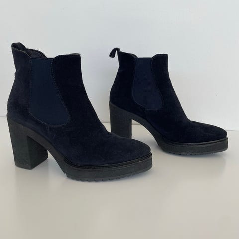 Helt ny, kun prøvd på inne. Str 38, men jeg bruker 39 så litt stor i str. Semsket skinn med fuskepels-for øverst og for i ull på innsiden. God såle. Mørk blå, mørkere en jeg får frem på bildet. Sort hel og for. Helen er 9 cm. høy.