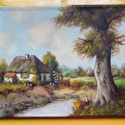 Sett farge på en trist krok hjemme! Akrylmaleri som viser vasen som står i Tveitevannet vedSletten i Bergen. Jeg har selv malt den og den er "one of a kind". Måler 20cm x 20cm x 2cm. Malt på 5 sider så ramme unødvendig. Sender gjerne. Se også mine andre annoner.