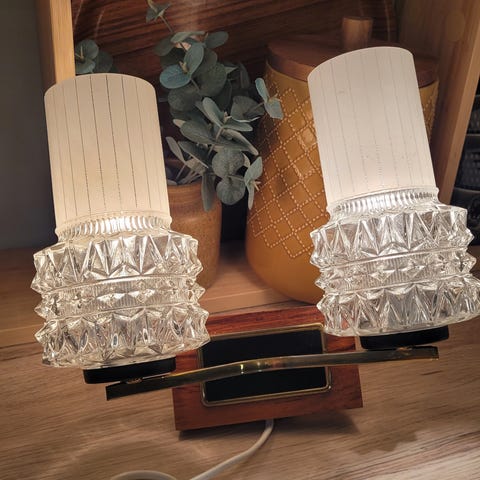 Klassisk teak speil fra 60-tallet med lampetter. Det pleide å være en liten skuff under speilet og derfor er det 4 små skrue hull der som ikke sjenerer syns jeg. Gir et fint og varmt lys.