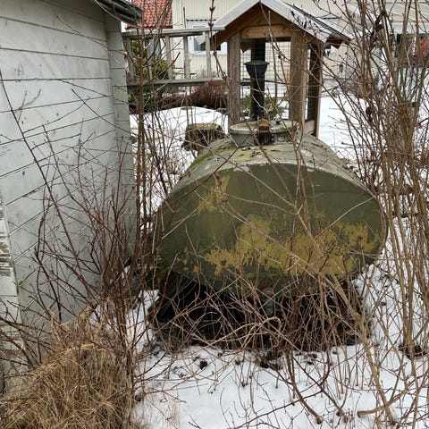 Tett ibc tank gis bort. Litt skade på grind. Har våre vatn på. Må hentast.