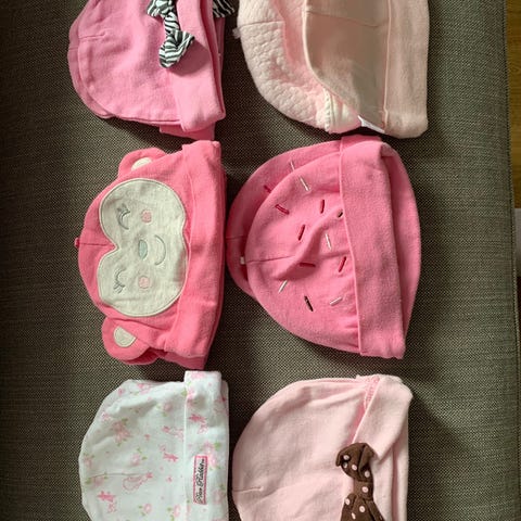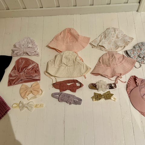 Tre tynne luer ( en størrelse 60, to i størrelse 70) en tykkere lue (68/74) og en caps (68) selges samlet.