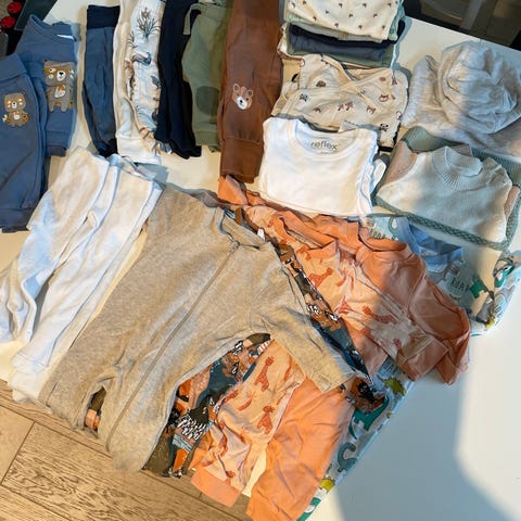 - 5 bodyer, hvorav 4 omslagsbody (de fleste med tilhørende/matchende bukse). Det ene settet er med julemotiv