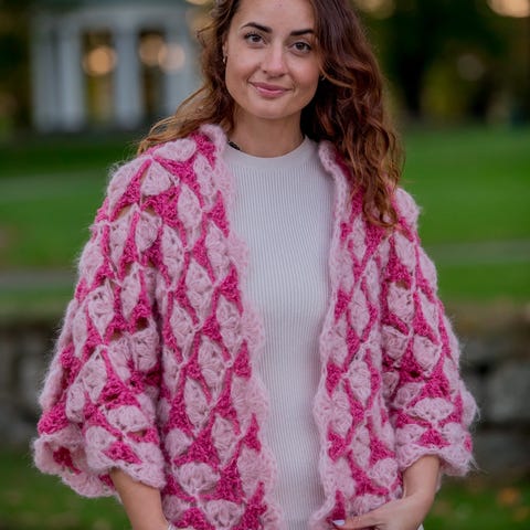 Jakke, jacket, selskap, grandmacore, pink, rosa, håndlagd, sjelden, rare, woman, lady, dame, genser, jumper.