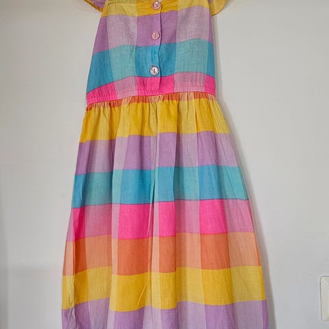 Kjole i mørkeblått med blomster, marihøne og sløyfe foran. 100% bomull med trykk knapper bak. Brukt en gang. Fremstår som ny.