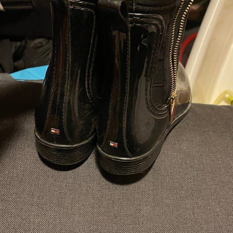 Tommy Hilfiger regn støvler selges. Kun prøvd på, men klarte å få 2 striper i ene støvelen (vist på bildet ( ser det godt pga blitz) men påvirker ikke bruk. Ikke særlig synlig.