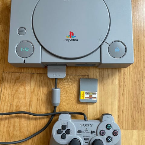 PlayStation 1 med en konsoll og alle ledninger. Og spill til salgs