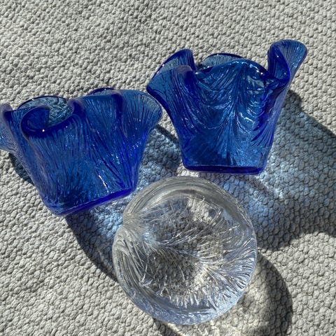 To blå lysestaker (blått glass med mønster) og to i furumønster fra Hadeland glassverk selges.